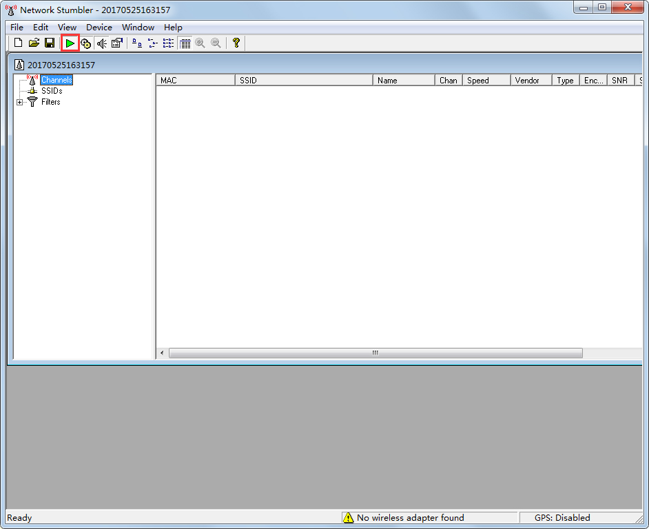 3、点击“绿色箭头”开始扫描,稍等后,软件会列出信号的mac地址,ssid名称等;