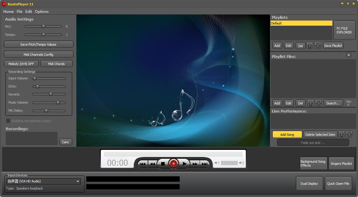 KantoPlayer 是一款非常好用的家庭卡拉ok软件,这款软件可以为你播放音乐伴奏并记录你的歌声。你可以随意添加自己喜欢的歌曲到播放列表中,软件支持将midi格式转换为mp3格式,推荐喜欢唱歌的用户下载使用。