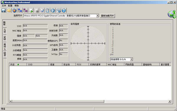 在中间右边区域看到当前环境下周边的无线网络信号基本情况,这里主要显示的是无线信道相关信息,包括有几个2信道,有几个6信道等,下面还有个切换按钮可以在802.11a与802.11b/g模式之间更换,估计绝大多数人用的无线网络都是b/g的,不过不知道为什么没有未来的趋势802.11n切换。