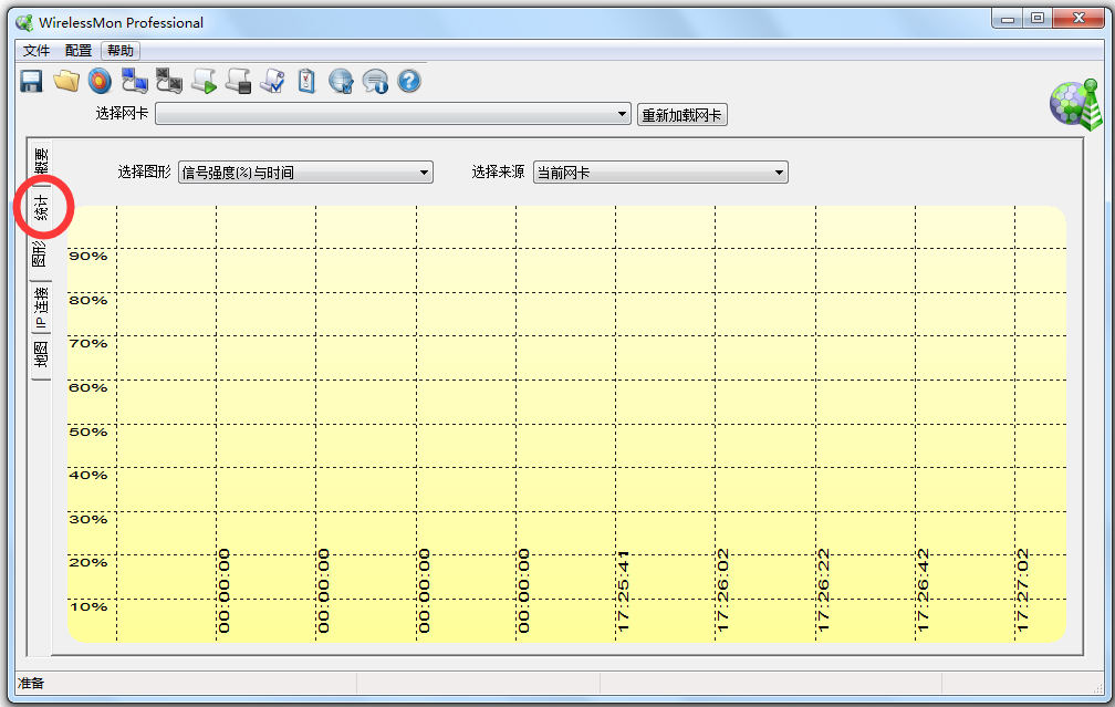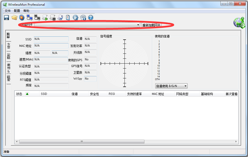 可以通过select network card右边的下拉菜单选择对应的无线网卡,需要注意的是,既然叫做WirelessMon,就只能对无线网络进行Monitor,无法支持有线网络速度测试。