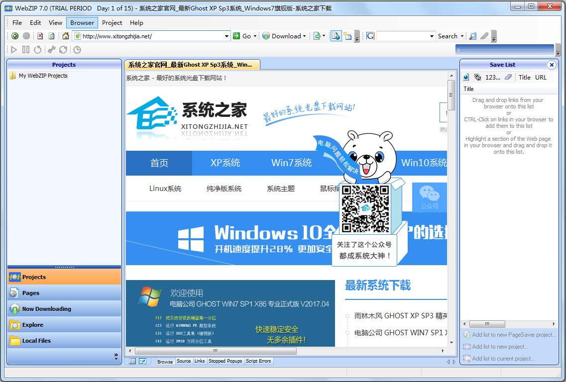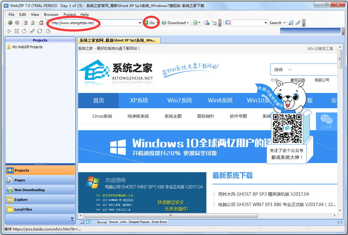 2、双击桌面上的图标打开WebZIP,输入一个需要下载的网站地址。如:WWW.XITONGZHIJIA.NET。选择旁边的“GO”,下方会出现系统之家网站的首页