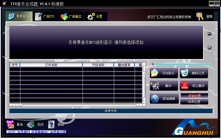 同时实现转换后与背景音乐的完美合成等功能;同时提供文字转声音(TTS)音质调整、背景音乐裁减等功能;集成广汇视达音质音效器及音频转换器,实现任意MP3转换及多种音乐效果处理;同时支持VBR、CBR、ABR等多种 MP3编解码;支持波形、频谱显示等功能。