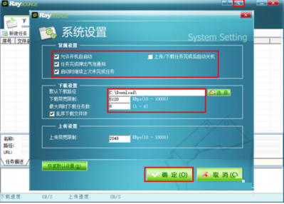 1.点击RaySource右上角的扳手图标,然后对程序的细节进行设置。建议取消勾选开机启动和将下载目录设置到非系统盘,其他保持默认。点击确定,然后重新启动raysource即可。
