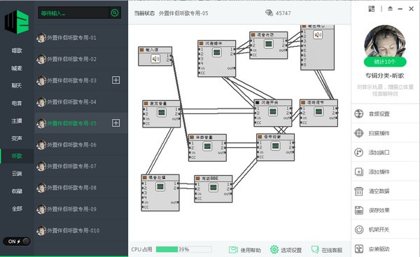 外置伴侣(也称新版一键电音),通过模块化的VST插件管理和DIY连线,可以实现非常多的声卡音效,如混响唱歌,MC喊麦。男女变声,特殊魔音/机器音/环绕音等等。 除了软件自带的音效以外,还可以通过云端下载你喜欢的各种音效(本功能仅供会员使用)。
