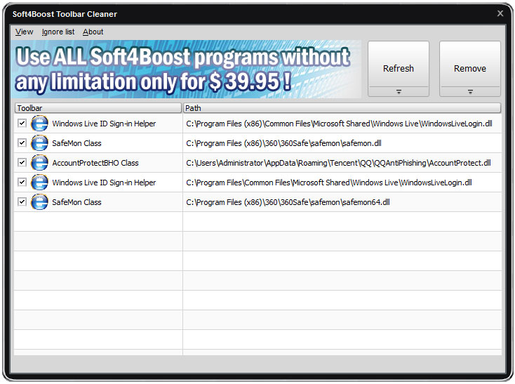soft4boost工具栏吸尘器的安装过程中,你可以选择你想使用列表中的好几个方案,包括荷兰,丹麦,西班牙,法国,意大利,英国的语言,和更多。一旦安装程序,简单的界面,为您提供定制的几个选项,并允许访问该程序的主要特点。从“视图”菜单,你可以选择喜欢的iPhone,Android,GPX,Bionix选择皮肤的变化,更。当你有你想要的外观,请单击“刷新”按钮来加载新的当前安装在您的计算机上的工具栏列表,然后用旁边的复选框来选择要删除的,然后单击“删除”。如果有任何工具栏,你想保持永久和你不想再出现在扫描,只需右键单击它在主列表,并将其添加到忽略列表。