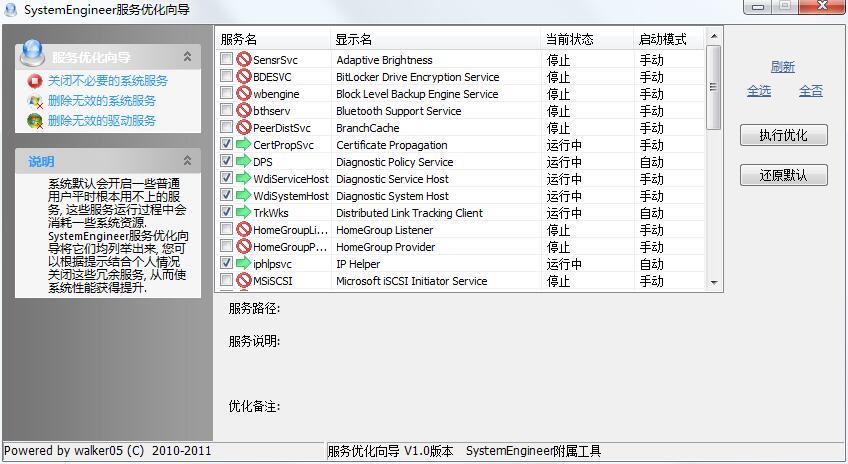 System Engineer是款相当不错的系统优化软件;它对各种信息服务进行快速的提高,可以让用户更快捷的审视自己的电脑配置,而且支持对最佳的参数进行设置,对网络的安全进行保障,包括了文件的清理、对多余的文件进行查找,还拥有各种独立的工具,也可对系统进行优化的设置,也对32位64位的操作系统支持。