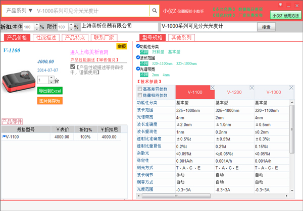 小仪Z仪器报价小助手是一款可以协助仪器经销商的商务人员,实现科学仪器(产品包括:干燥箱、试验箱、天平衡器、离心机、光谱仪器、电炉、色谱、气体检测、水浴水槽、旋转蒸发器、粘度计等几千个产品系列)设备快速选型,同时显示产品价格、图片、性能描述、产品样本及技术参数等相关信息,并能和Excel紧密结合,通过插入按钮将产品信息插入到Excel来实现轻松准确的报价,减少人为失误,大大提高工作效率。