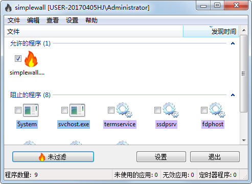 1、下载解压后运行simplewall程序,第一次打开时默认是未启用防火墙的(状态栏的图标是灰色),点一下下面的“未过滤“按钮,启用防火墙;
