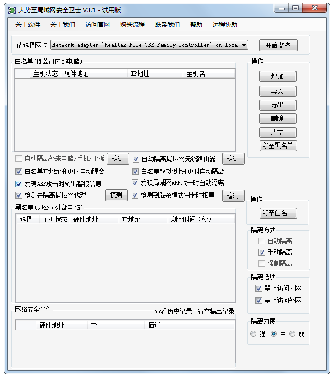 大势至内网安全卫士是一款专门的局域网接入管理软件、网络准入控制系统,可以有效防止外来电脑随便接入公司局域网、禁止局域网内部电脑相互通讯、检测局域网无线路由器、禁止局域网代理、检测局域网手机和平板电脑等,全面保护局域网网络安全。