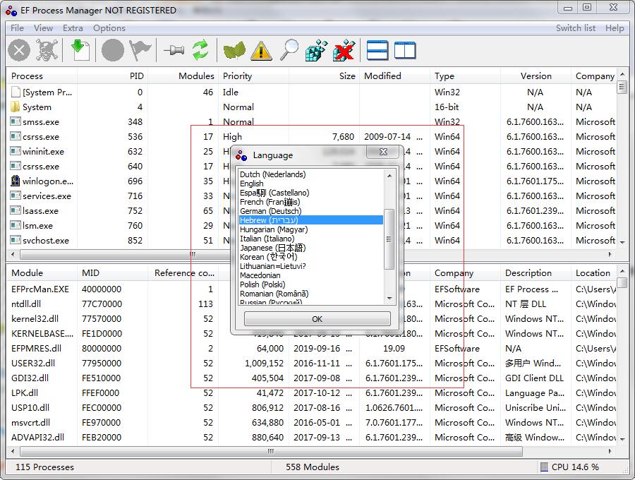 EF Process Manager是一款系统进程查看工具,除了查看系统进程和后台程序外,它还可以针对每个进程进行操作。软件支持多种语言。