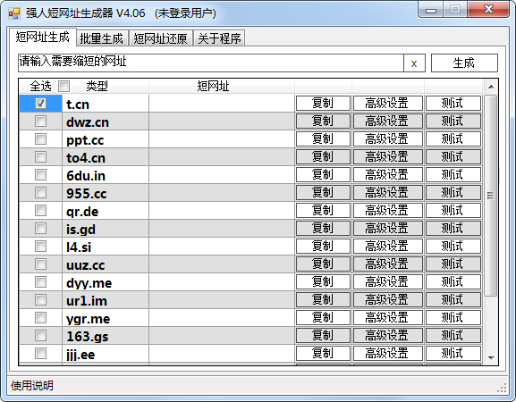 PS:软件永久免费使用,2011年推出强人短网址生成器V1版本至今已经升级到V4.03版本,软件更新后会有升级提醒,软件为绿色软件,下载最新版本即可使用。