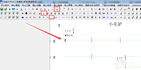 6.认识常用的工具。音符1,2,3,4,5,6,7上面一行有高音低音符号,123表示正常的音高,左边的是低音点,右边的是高音点。下面一行有减音和延音符号。例如如要输入八分音符,就要单击“_“和数字,然后光标移到第一小节虚线处单击一下。