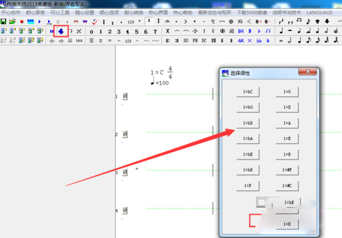 3.更改调性方法。如何改调号呢?单击下图所示的调性按钮,选择一个调性,单击确定。光标移到默认的调号处,单击一下,就改变调性了。当然喽《小毛驴》是C调无须改变。