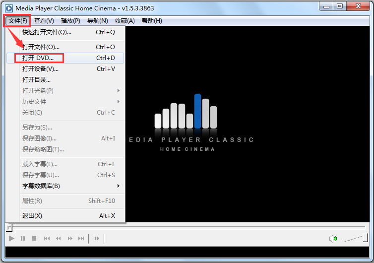 它支持DVD文件播放,只要在菜单中点击“文件→打开DVD”或者按快捷键“Ctrl+D”就能播放光驱里的DVD影片。