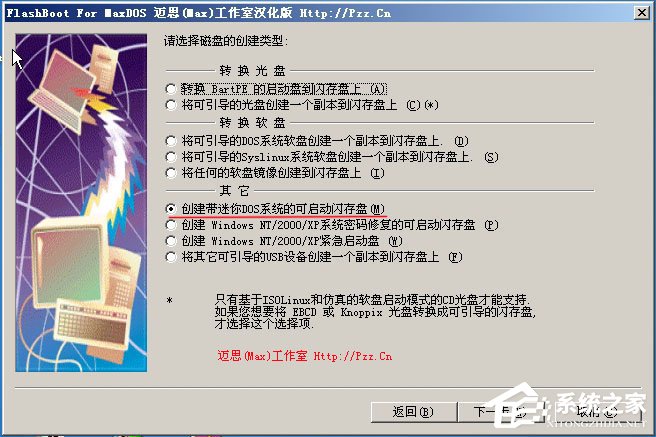 2、选择您要通过哪媒体创建U盘启动,由于我们制作的是DOS启动,所以我们选择“创建带迷你DOS系统的可启动闪存盘”;