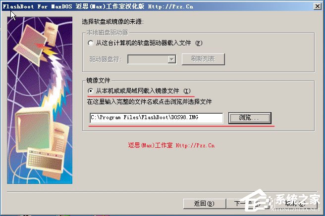4、然后在下图中选择你的DOS启动盘的软盘镜像,如果您没有,可以选择FLASHBOOT安装目录中的由我们集成的DOS98.IMG镜像,此镜像已包含MSDOS 7.1的启动文件;
