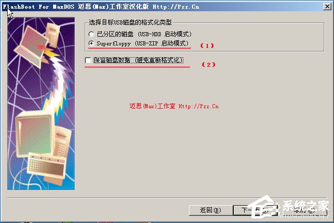 6、在这一步选择U盘的启动模式,大家的都USB-ZIP的启动模式相对来说兼容性,及稳定性都相对要好,而且启动后就直接是A盘符,这样大大的方便了我们制作DOS启动。所以这里我们建议您选择USB-ZIP模式,如果您要保留U盘的资料请先选中启动模式如:USB-ZIP,然后再选择“保留磁盘数据”这样可以不格式化U盘而直接制作引导了;