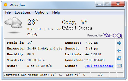 sWeather是一款非常好用的天气预报软件,这款天气预报软件可以在系统托盘中显示指定城市的天气和温度,使用的数据来自于yahoo天气,所以数据的准确性也是无容置疑的!