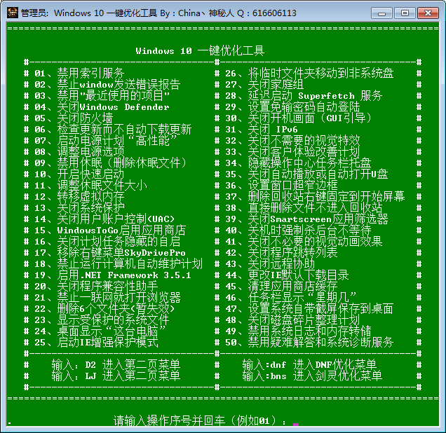 Wndows10一键优化工具是针对Windows10系统打造的一款系统优化软件,该软件为用户提供了禁用索引服务、关闭防火墙、开启快速启动、转移虚拟内存等50多种实用功能,除此之外,还具有DNF和剑灵两款游戏的优化功能。