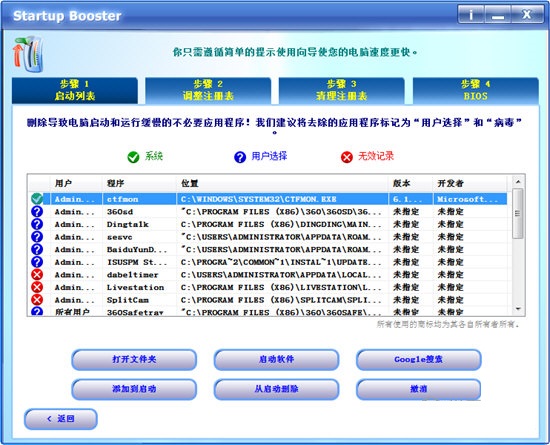 删除导致电脑启动和运行缓慢的不必要应用程序!建议将去除的应用程序标记为用户选择和病毒。