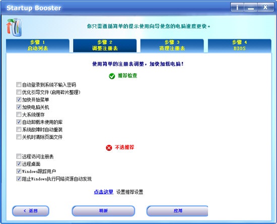 第一步叫做启动列表。它删除了启动操作系统时不希望计算机加载的内容。第二阶段旨在调整注册表以加速PC加载。应用程序建议检查或取消选中什么,只要按照说明并按“应用”按钮完成即可。