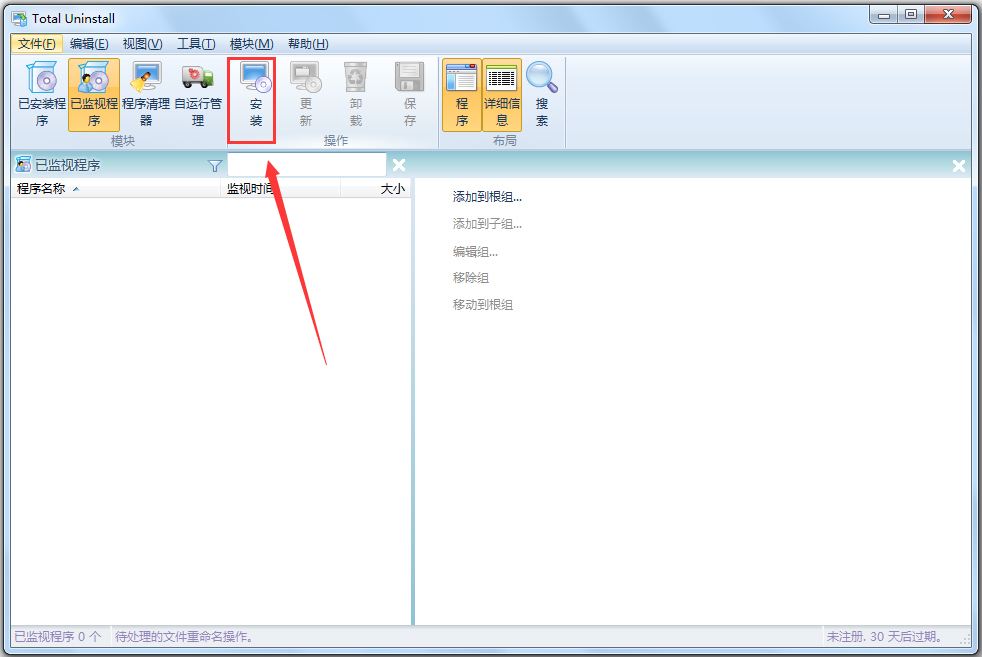1、运行Total Uninstall 软件。点击“已监控程序”,运行“安装”选项。
