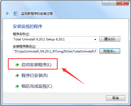 4、安装程序路径中有内容后,点“启动安装程序”。不是通常的直接安装软件,而是用Total Uninstall 软件来进行安装。