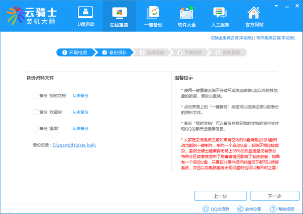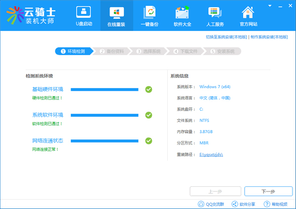 2、进入软件“在线重装”,工具自动为电脑进行检测,完成后点击“下一步”后, 云骑士将为你电脑进行备份;