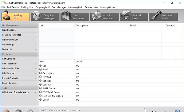 时事通讯软件是一种专门的邮件客户端,可以向联系人列表发送电子邮件。每个订户都会收到一封唯一的电子邮件,可以使用联系人数据库进它还包括其他功能,例如使用Web表单的自动订阅。 MaillistController是Windows PC的软件产品,而不是托管的在线服务。它使您可以直接从自己的计算机发送电子邮件新闻稿,而无需使用昂贵的Web服务。您只需要一个电子邮件帐户(托管或来自您自己的服务器)和常规Windows PC。 Arclab MailListController是简报邮件和电子邮件营销活动的完整解决方案。试驾我们的软件或使用免费版本,只要您愿意。无需注册。