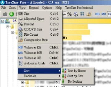 4、多种文件夹大小计量方式。默认情况下,文件夹体积是使用KB、MB来计量、不过你也可以在view菜单中改成百分比显示。