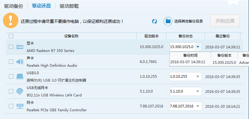 4、如果您需要还原原来的驱动,您可以点击“驱动还原”选项,然后在勾选你要还原的驱动,点击【开始还原】即可。