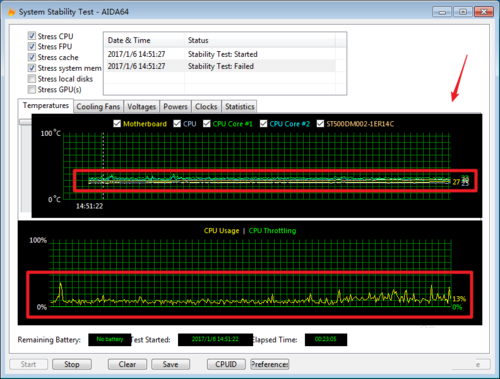 5、最后,AIDA64烤机测试完成,如下图:线条起伏不大,表明小编的电脑还是可以的哦。小伙伴们可以下载后测试自己电脑哦。