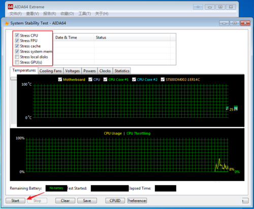 4、此时已经进入到AIDA64烤机过程了,这个过程大概会持续十分钟多,最好的电脑烤机是会持续2小时以上哦。小伙伴们需要耐心等待哦。