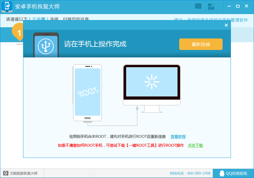 软件会自动检测手机是否有root,如果提示手机未root,请先下载root工具对手机进行root操作后点击“重新连接”按钮;