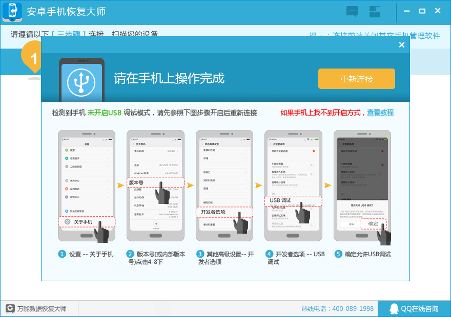 软件会自动检测手机是否有打开USB调试模式,如果USB调试模式未打开,请先打开该模式后点击“重新连接”按钮。