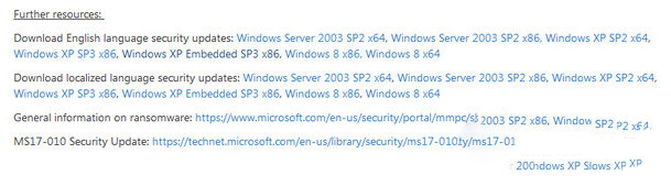 对于Vista及以上版本的操作系统,开启自动更新即可保障安全。对于XP系统,对于安全最负责的办法是尽快升级Win10。然而,考虑到部分机型硬件已不适合升级,另一部分电脑备份数据需要一段时间。现提供一枚补丁安全补丁用于应急,该枚补丁适用于32位 Windows XP SP3全部版本(包括家庭版、专业版、嵌入式版本)。