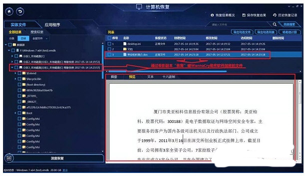 根据网上的资料,WannaCry病毒在运行后除了加密特定类型文件,还会清除系统中的卷影副本数据。但通过我们研发人员的实际测试,在部分版本(主要是64位)的系统中,卷影副本并未被清除。如果被感染的计算机还存在卷影副本数据,通过一定的方式读取并导出文件的历史版本,即可“恢复”出相关数据,若计算机在被感染前一天有开机系统默认备份过,更有可能实现100%数据恢复。