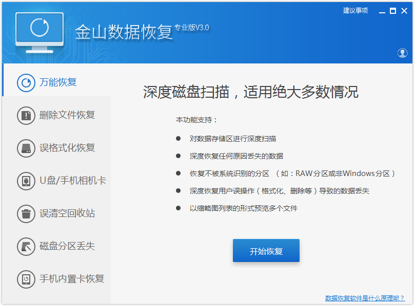 金山数据恢复软件是金山在数据恢复领域20余年技术积累的重要产品。金山数据恢复可以帮您恢复多种意外造成的数据丢失,可以恢复多种格式文件,包括文档、视频、照片、软件、压缩包等等。能恢复已删除的文件,移动硬盘/u盘的文件恢复,还能恢复受损盘的文件以及被格式化的文件恢复。软件直接提取自金山毒霸里面提取的会员专业组件。本站提供金山数据恢复软件免费下载。