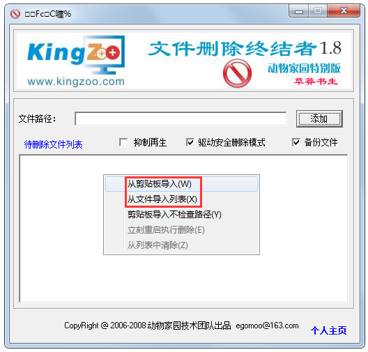 1、手动填写删除文件路径或者拖曳文件到列表框内,按回车就会自动加入到待删除文件列表中。当在网络求助时候,你可以直接从剪贴板导入或文本文件导入。如下图