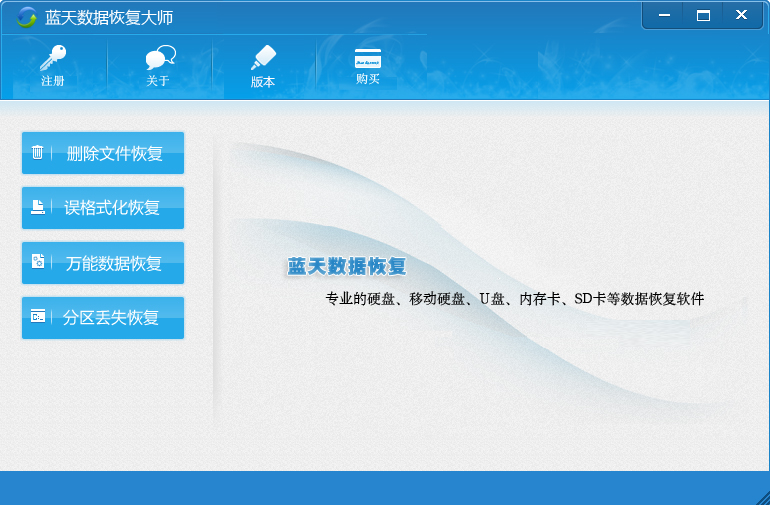 蓝天数据恢复大师是一款实用的电脑数据恢复工具,可帮助用户恢复电脑硬盘数据、U盘、sd卡、移动硬盘的数据,拥有删除文件恢复、误格式化恢复、万能数据恢复、分区丢失恢复等多种数据的恢复功能,欢迎下载使用。