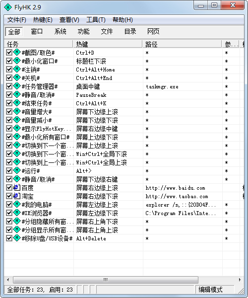 FlyHotKey(飞哥热键),是一个快速启动任意程序的绿色工具,可以一键启动文件、文件夹、网页;一键执行系统命令,如打开我的电脑、静音、关机等;一键控制窗口,如隐藏、显示、置顶、透明,一键截图/取色等;支持鼠标快速启动程序,桌面、标题栏、任意位置配合鼠标中键和右键完成。另外,还有闹铃和定时执行(计划任务)功能,可以设置密码保护,使其他人无法查看;可以随系统自动启动,支持文件和文件夹拖动功能,快速建立任务。