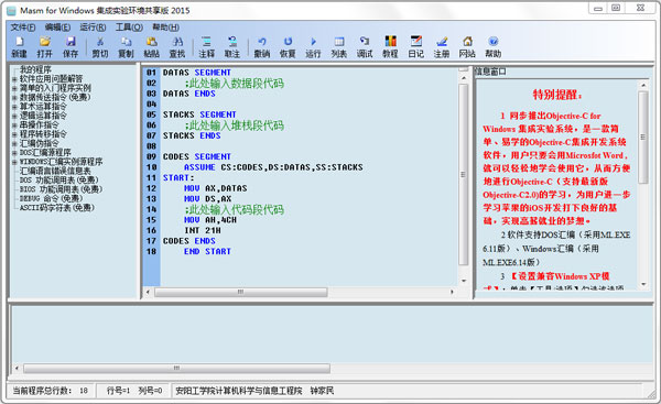 Masm for windows 集成实验环境是从事一线教学的大学教师针对汇编语言初学者的特点开发的一个简单易用的汇编语言学习与实验软件,支持最新操作系统WINDOWS 7,支持DOS的16/32位汇编程序和Windows下的32汇编程序(并提供调试通过的35个WINDOWS汇编程序实例源代码),它具有错误信息自动定位、关键字实时帮助并且在帮助中动画演示汇编指令的执行过程、语法着色、无限次撤消与恢复、WORD式的查找、替换、定位、支持中文、长文件名等功能。