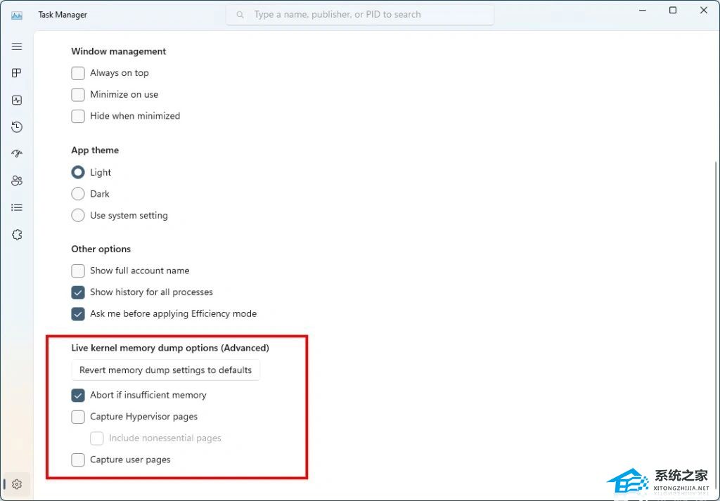 还可以转到“任务管理器设置”页面来查看 / 编辑实时内核内存转储的设置。