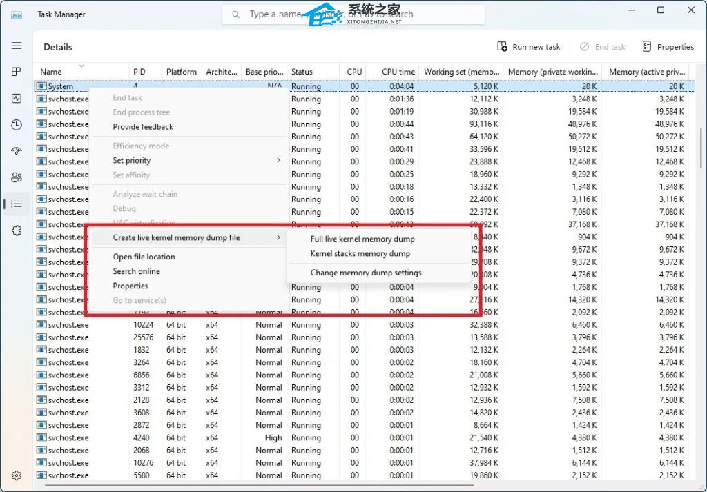 要使用实时内核内存转储 (LKD),请转到任务管理器中的详细信息页面,右键单击系统进程,上下文菜单应亮起以显示“创建实时内核内存转储文件”以获得完整的实时内核或内核堆栈内存转储。