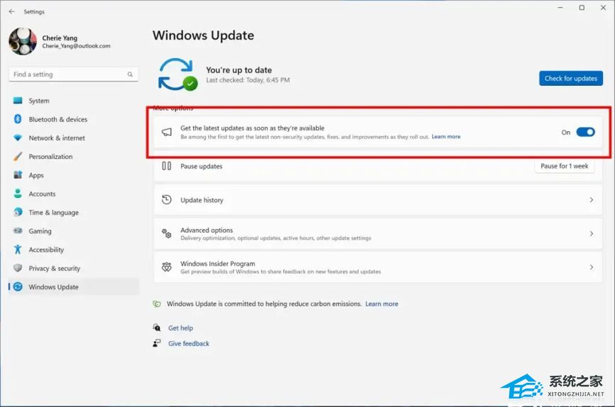 在 Windows 11 build 23424 上,“Windows 更新”页面现在包含一个新的“在更新可用时立即获取”设置,这意味着 Beta 频道用户可以更无缝地切换到支持包。