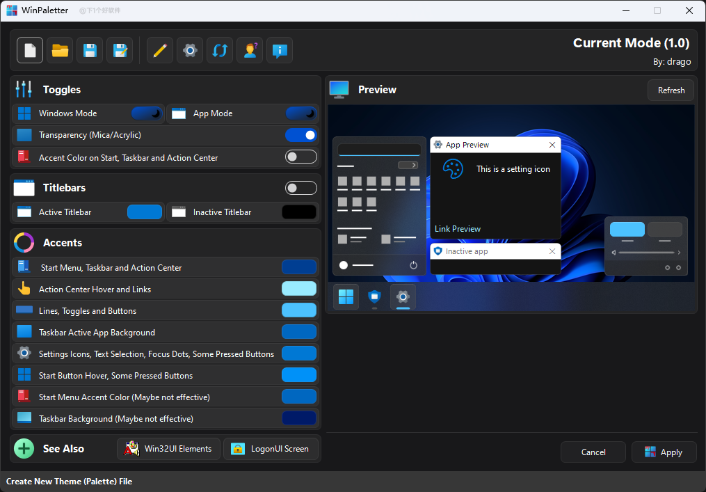WinPaletter是一款可以让用户自由调整修改的Windows界面颜色/美化工具。该软件支持单独修改系统界面的一些元素颜色,例如标题栏、任务栏、开始菜单等等。该软件原理其实都是通过修改注册表来实现,喜欢折腾界面美化的可以下载一个试试看。
