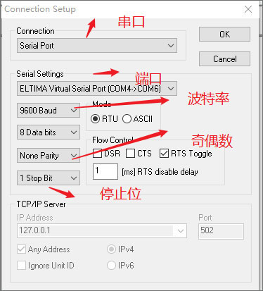 5、首先打开页面后我们需要进行连接及设置 Connection——Concection Setup ,这里设置好需要的参数;