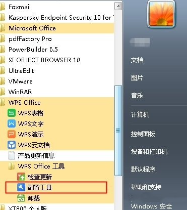 1、重新安装WPS,在开始菜单找到WPS的“配置工具”并打开;