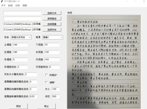 手写模拟器demo绿色版是一款功能强大的文字转换工具,软件为绿色版,不需要安装直接打开就可以使用了。可以够帮助用户轻松将文档模拟成手写文字的图片,为文档的手写转换提供了提供。软件能够自由的选择字体,支持整篇文章进行转换,满足用户的各种文档手写模拟功能需求。
