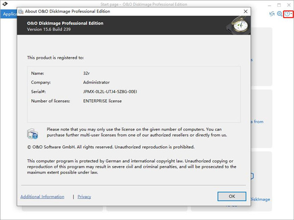 7、双击打开O&O DiskImage Pro破解版软件,点击红色选框下的About,如下图软件破解完成,可以放心使用软件。